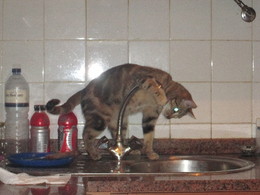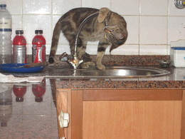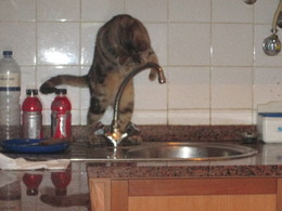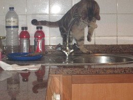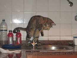 E assim passa ela o seu tempo livre - a tentar beber água pela torneira! E se nos vê com uma garrafa de água na mão, põe-se em pé agarrada a nós para ver se lhe calha!